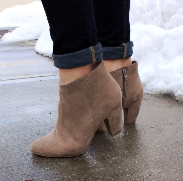 Then roughly two falls ago, booties got really big. Like everyone owned them. And everyone wore them the same way. Ripped jeans…oversized sweater… and I started thinking. There has got to be more than one way to wear these things. So I dedicated my time to Pinteresting every picture of booties I could find (if you go back in my “Pinterest Closet” you can actually see this phase I went through. Approx. 110 pins about booties), experimenting with different outfits I owned and window shopping just so I could see what outfits the store had put together with the booties.