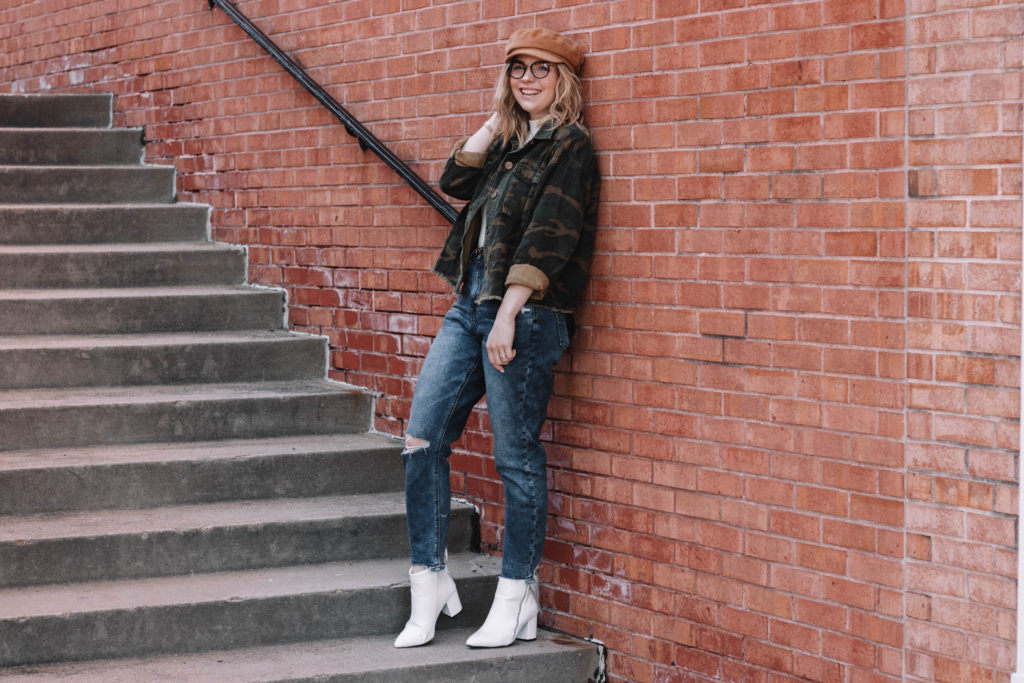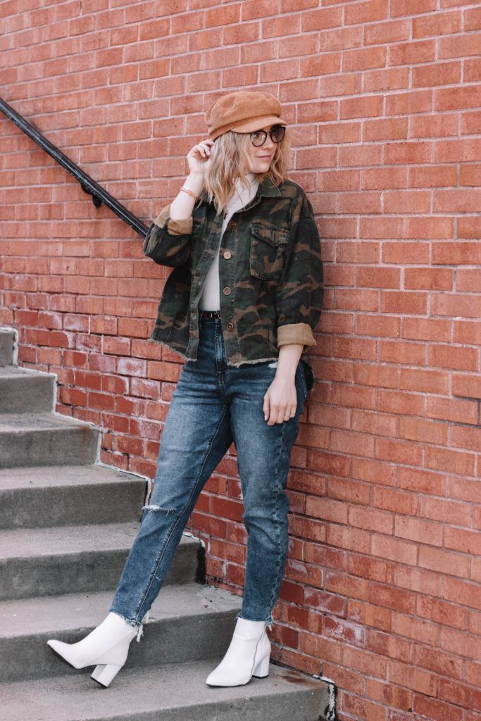 This jacket is a new Amazon FAVE. Seriously. I love it so much. I ordered 2 sizes originally – a small and a medium and I ended up keeping the medium. I like the boxy fit, and honestly there just wasn’t a ton of difference between the sizes. I figured I could layer a sweater if I wanted to under the medium. It hits right at your waist and has a raw edge hem. It’s the PERFECT layering denim jacket. If you’ve been wanting an easy introduction of camo to your closet- this is it. And it’s less than $30. SCORE. I actually saw this exact same jacket at a boutique near me and they had it retailing for $70!